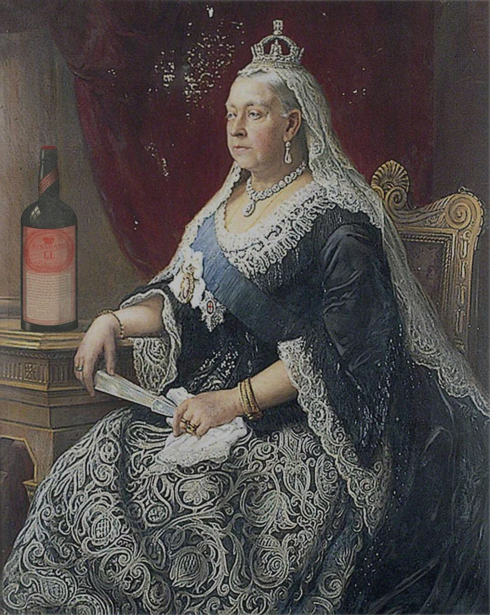 • A woman dressed in royal attire with jewelry, a crown, and a veil, sitting on an ornate chair, holding a fan, in a formal portrait setting. There is a large bottle of alcohol on a small table beside her.