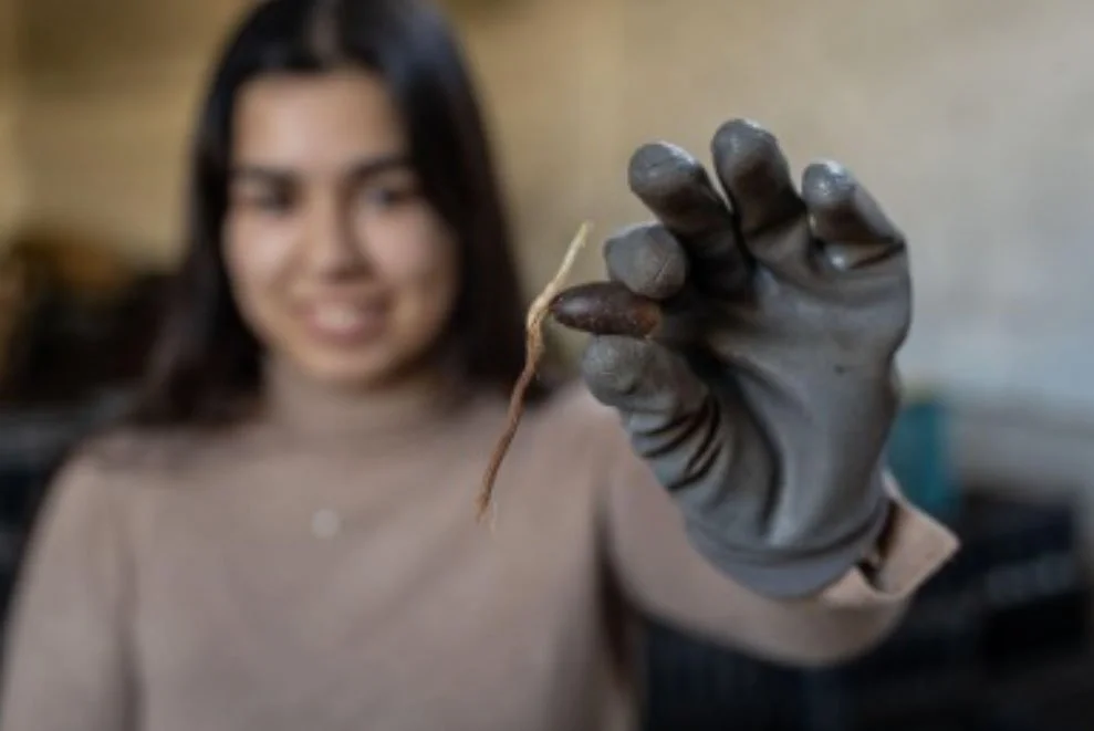 • A man with dark, wavy hair and a beard, wearing a white lab coat, is working on a sculpture in a workshop with various art tools and sculptures around him.