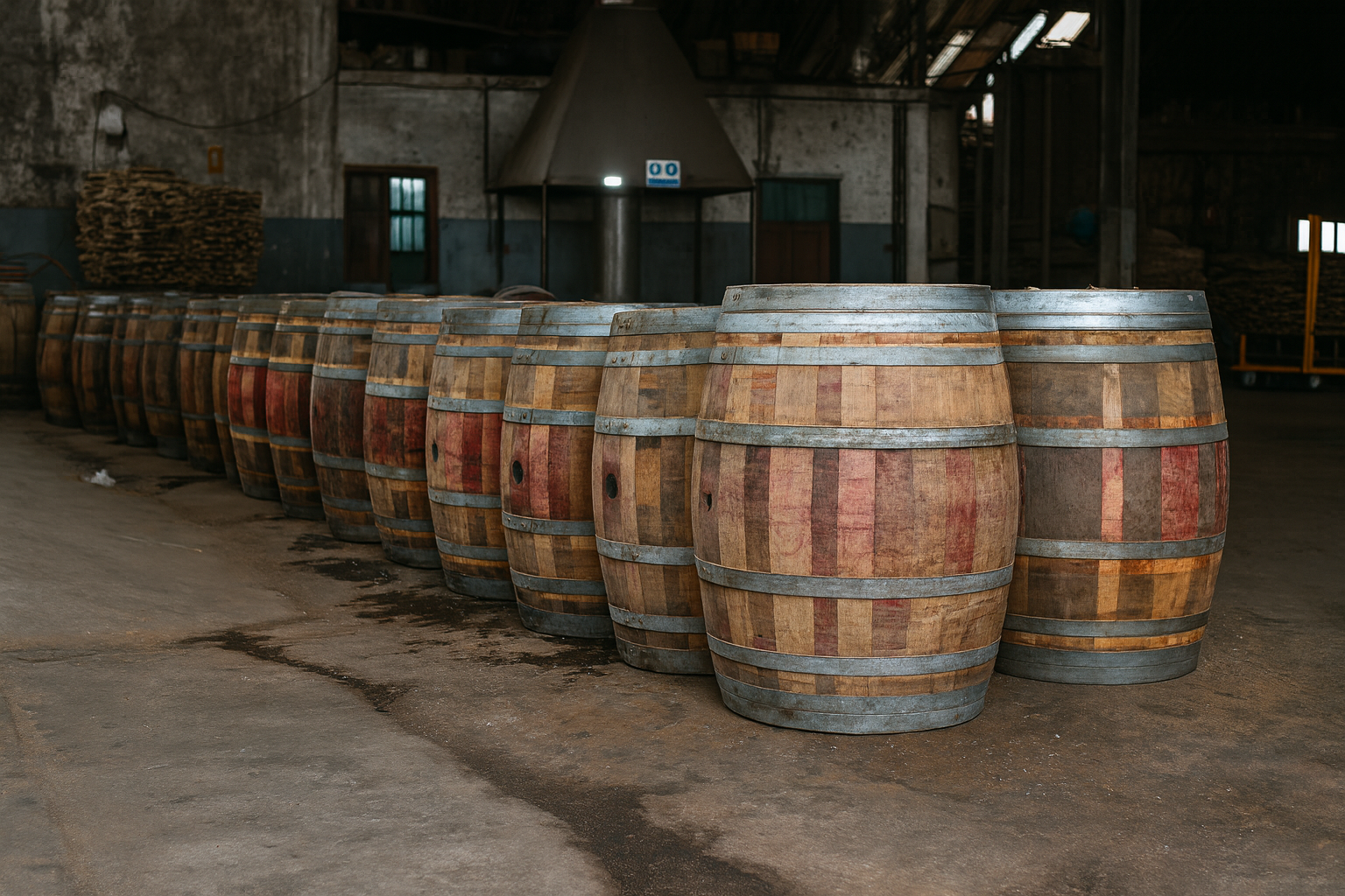 • Multiple wooden barrels lined up inside a rustic distillery or warehouse.