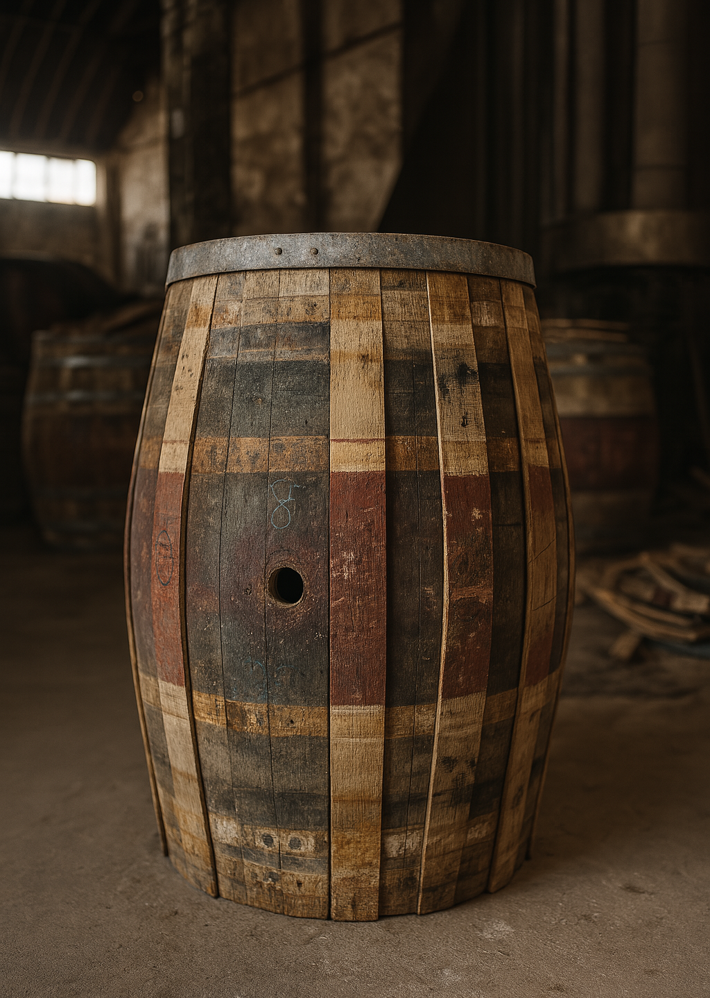 • A wooden whiskey barrel in a rustic warehouse with other barrels in the background.